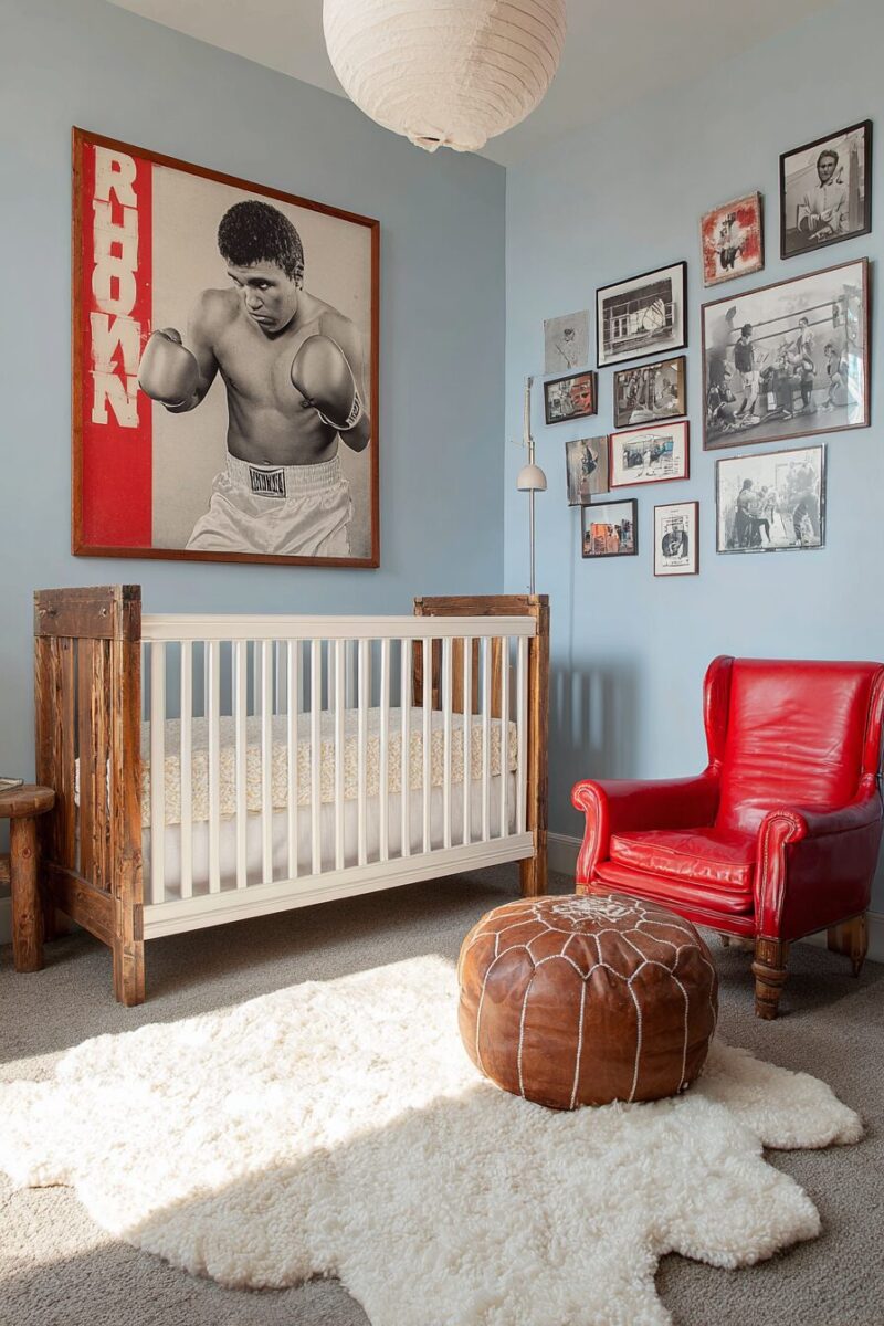 Transform your nursery into a tribute to boxing’s legendary past with vintage gloves, championship belts, and old-school training equipment displays.