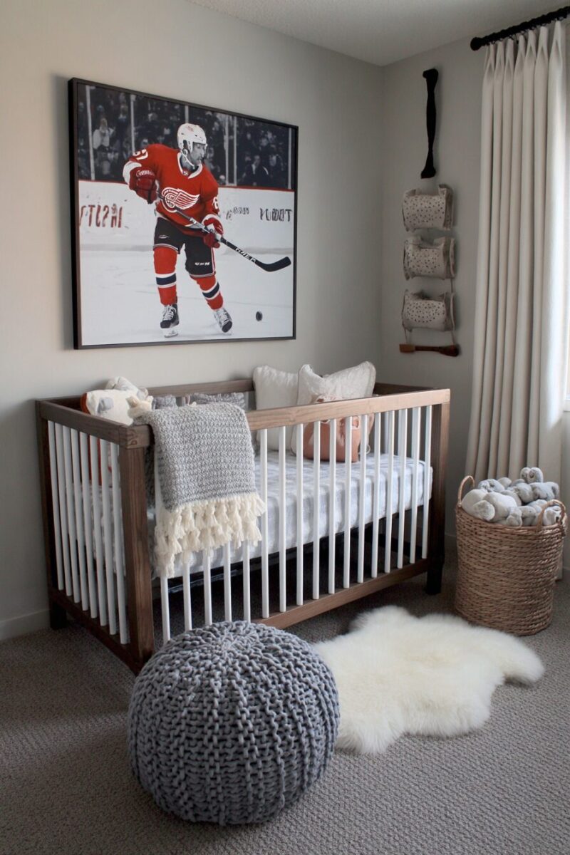 Create a nursery that celebrates hockey’s rugged history with authentic vintage sticks, classic team jerseys, and old-school arena elements.