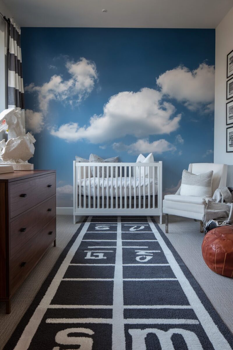 The ceiling gets the full treatment with a painted sky complete with fluffy white clouds, making your little slugger feel like they’re playing under the perfect afternoon sun.