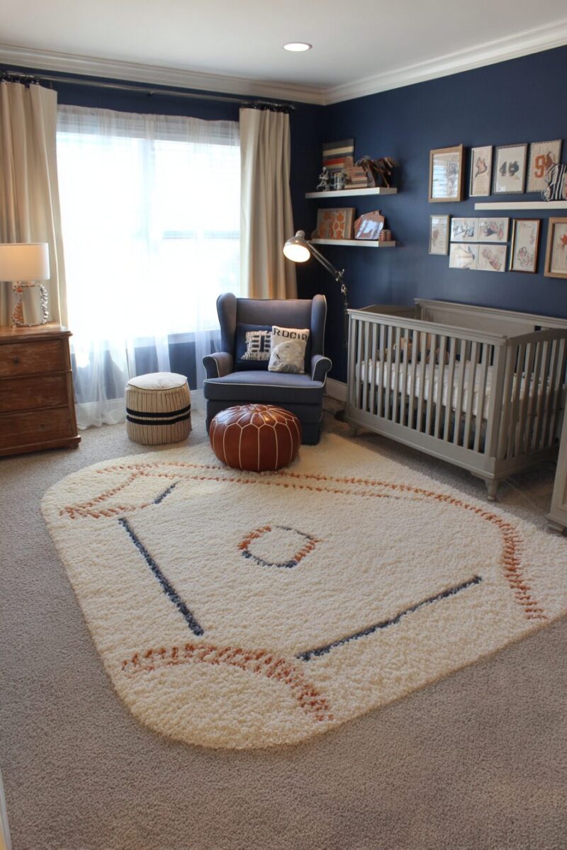 The final touch comes from a custom area rug designed to look like home plate, positioned perfectly under the rocking chair where you’ll spend countless hours with your future Hall of Famer.