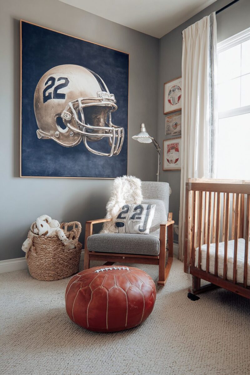 Transform your nursery into a shrine to football’s golden age by showcasing authentic leather helmets from the sport’s early decades.