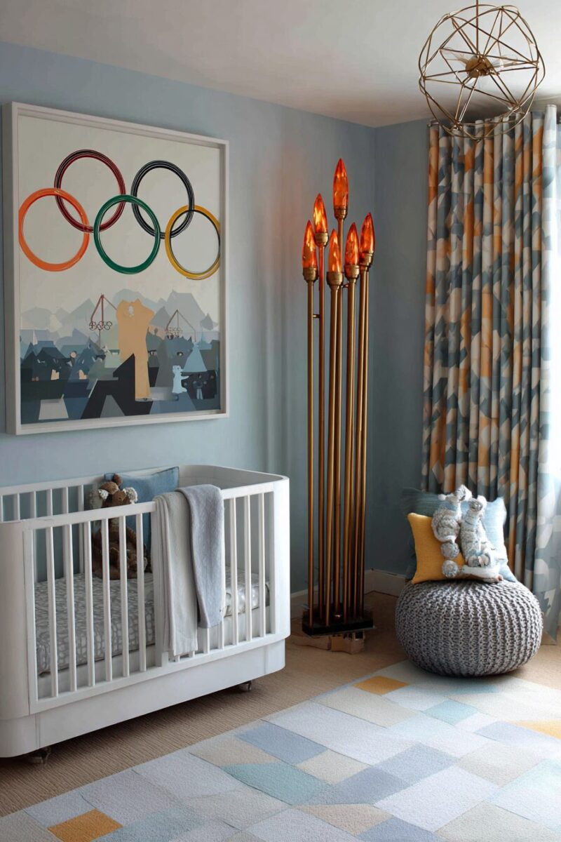 Transform your nursery into a celebration of Olympic heritage with authentic vintage Olympic memorabilia and classic five-ring symbolism.