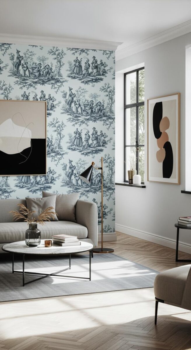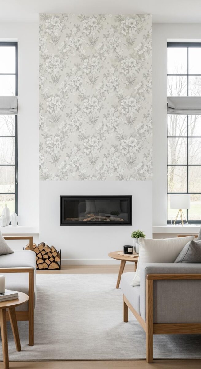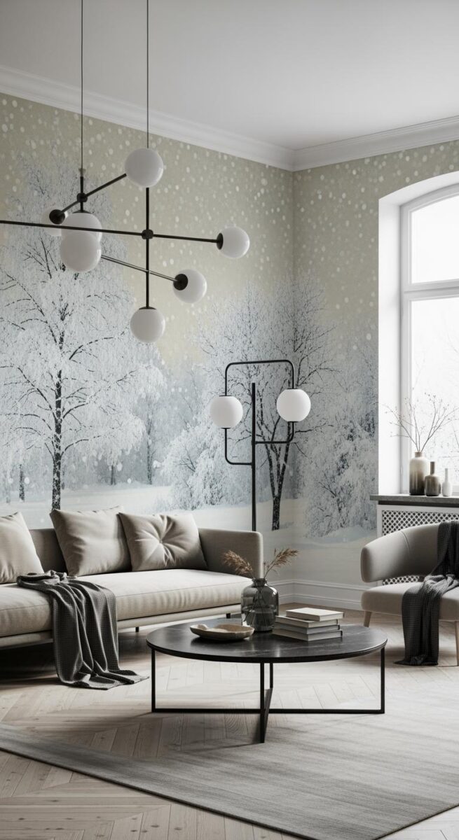 The wallpaper provides a neutral, elegant base, and you can layer in winter touches—greenery, candles, cozy art.