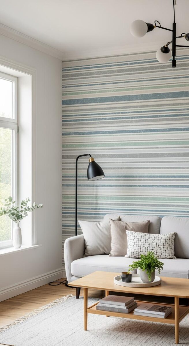Faded stripe wallpaper—especially in soft winter hues like dove gray, cream, and pale blue—creates such a subtle, elegant backdrop.