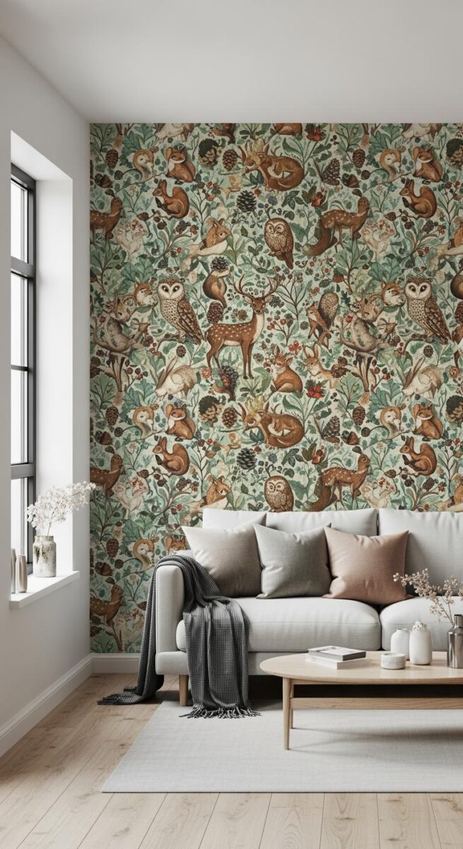 If you want something playful yet still sophisticated, consider wallpaper featuring vintage-style woodland creatures.