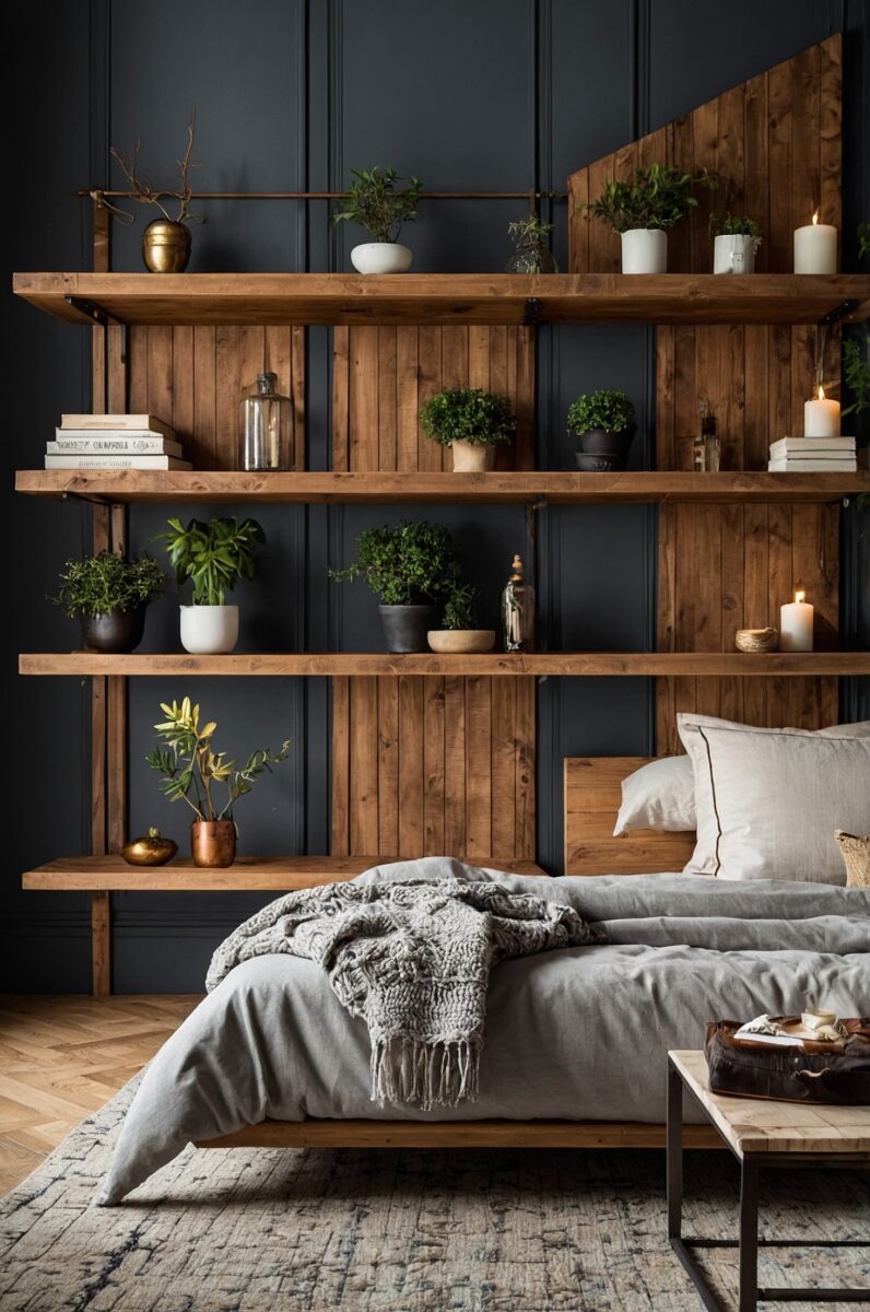 Floating shelves made from reclaimed wood showcase your books, plants, and decorative objects while adding horizontal lines that make rooms feel larger.