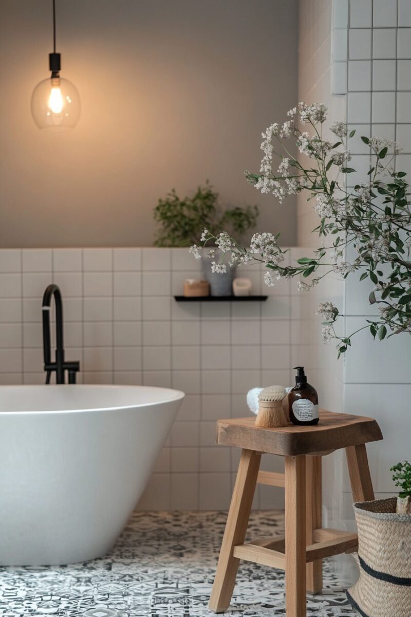 Add a small indoor bamboo plant or two for a living element that thrives in the humid bathroom environment.