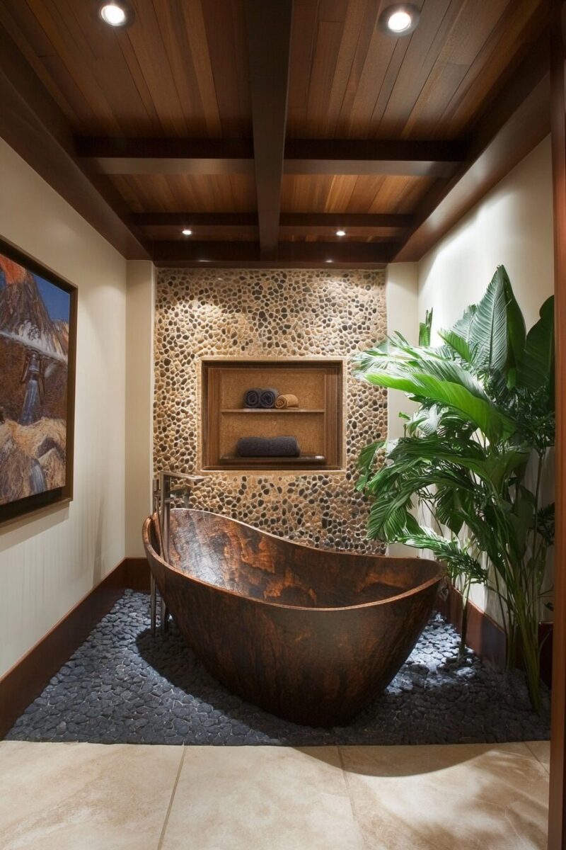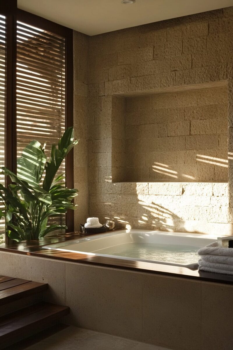 You’ll find that the combination of warm woods, natural stone, and minimal décor creates a meditative space that feels worlds away from the typical bathroom.