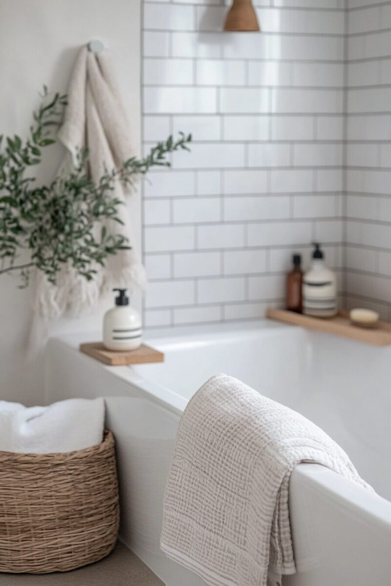 For accessories, embrace objects with minimal processing – wooden bath brushes, stone soap dishes, linen towels in undyed natural colors.
