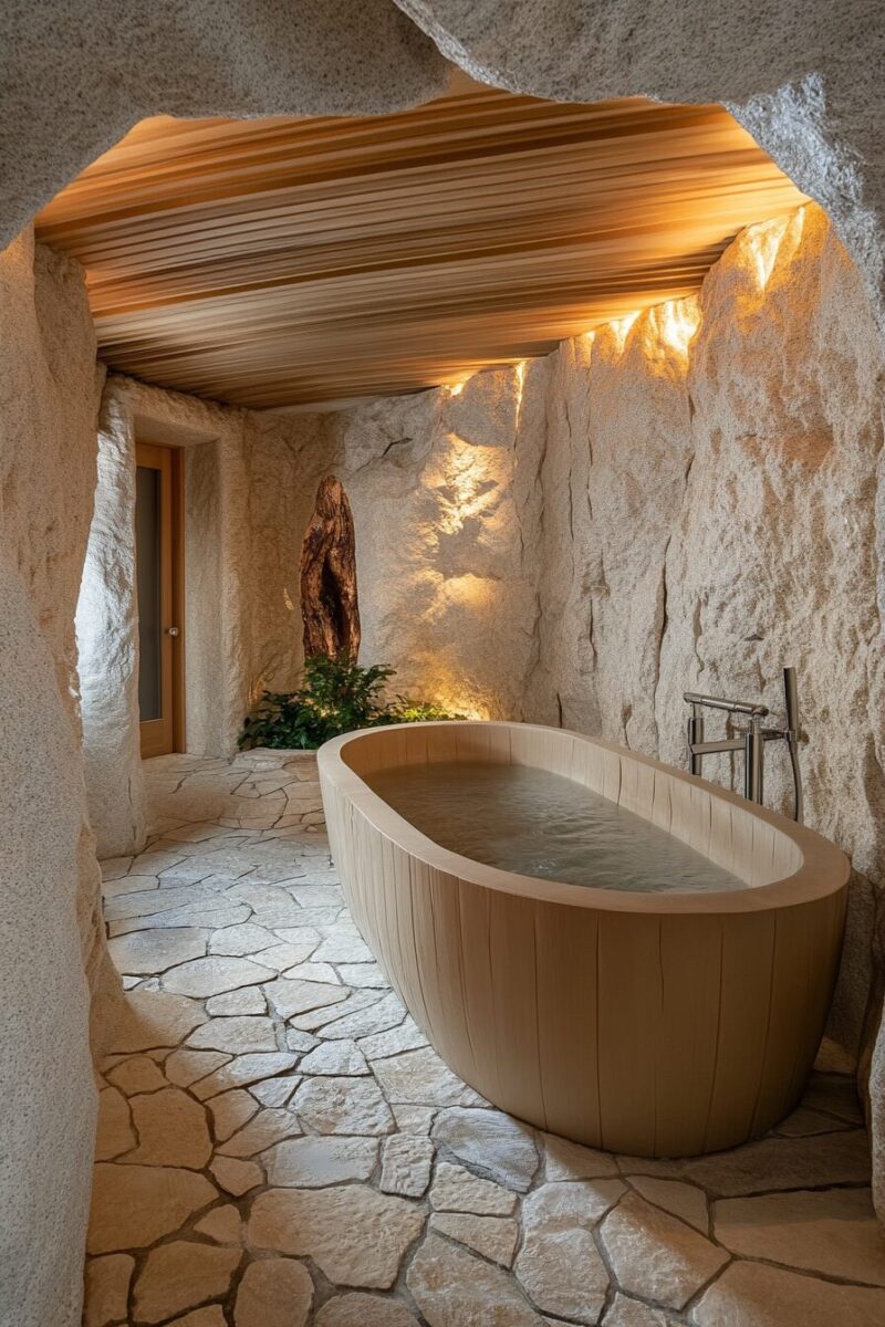 Imagine being surrounded by natural stone, sustainably harvested wood, and living plants in a bathroom that feels like a secluded forest grotto.