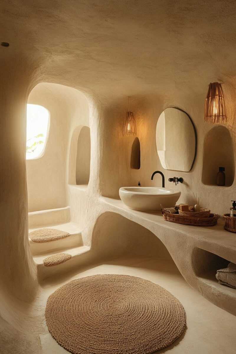 You’ll discover that curved architectural elements – arched niches, rounded doorways, or alcoves for bathing – soften the space and reference the ancient building techniques of Mediterranean regions.