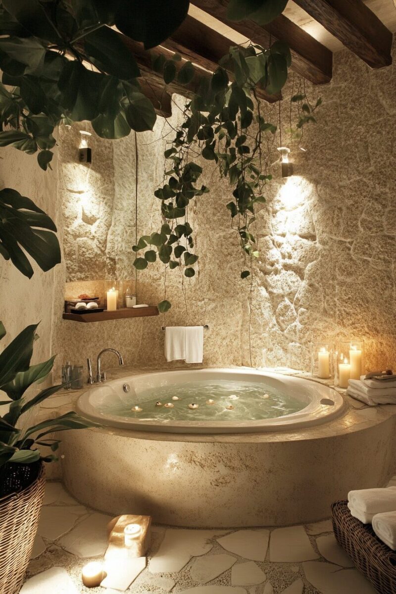 Imagine stepping into a bathroom where living greenery cascades from shelves and steam rises from a stone-surrounded soaking tub.