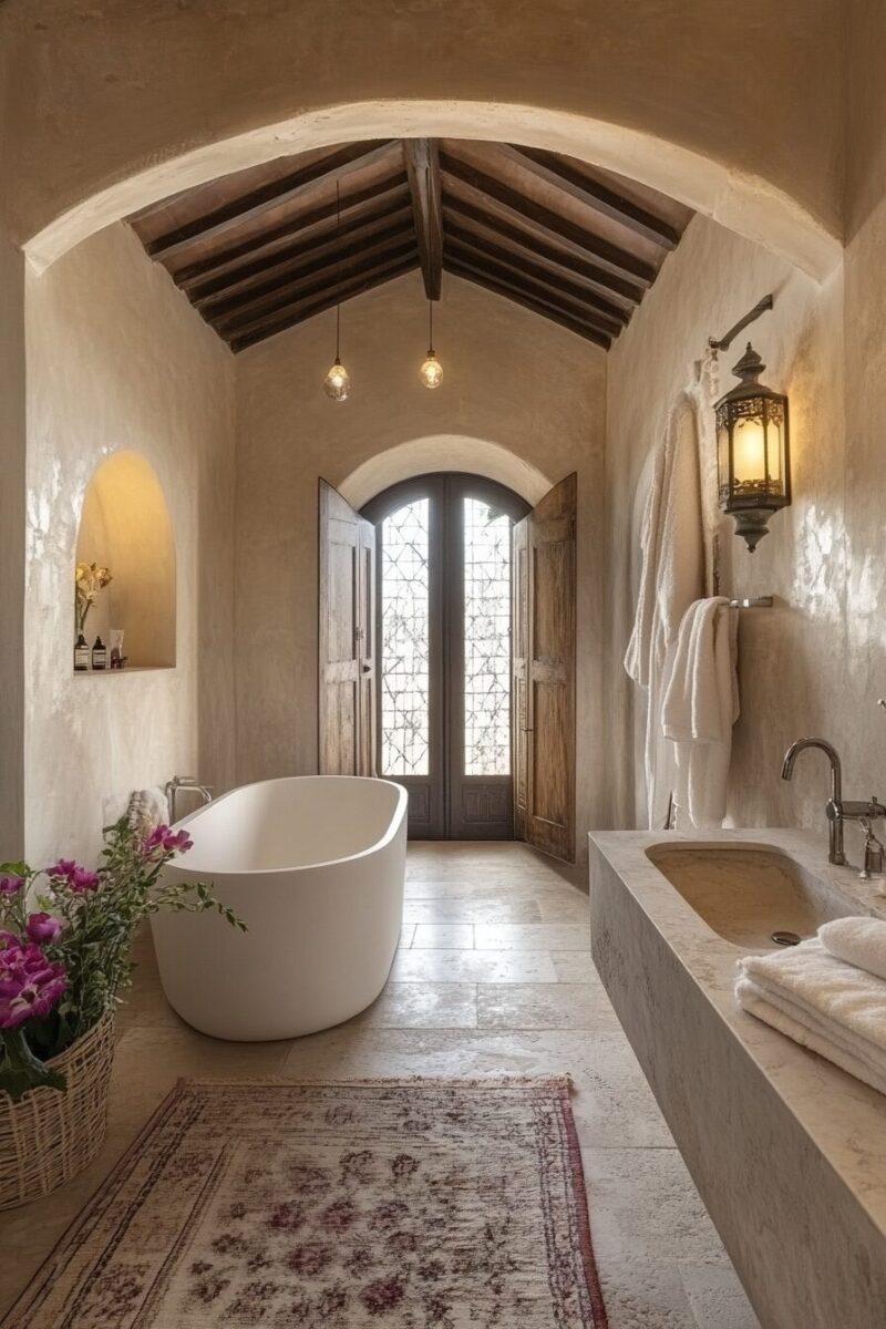 The centerpiece of this style is often a large tadelakt shower area – a traditional Moroccan plaster finish that’s waterproof, seamless, and feels luxuriously smooth to the touch.