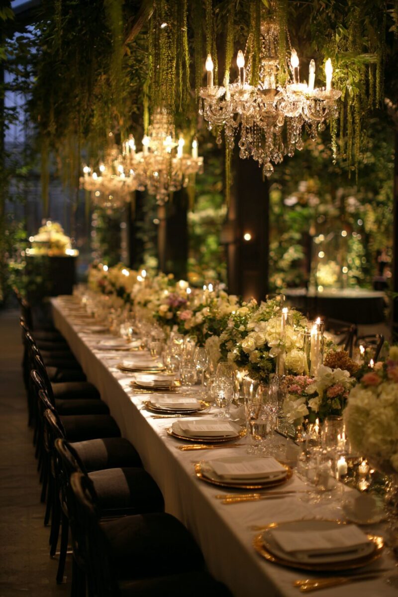 Suspended crystal chandeliers at table height create intimate lighting that makes every guest feel like royalty dining in a palace ballroom.
