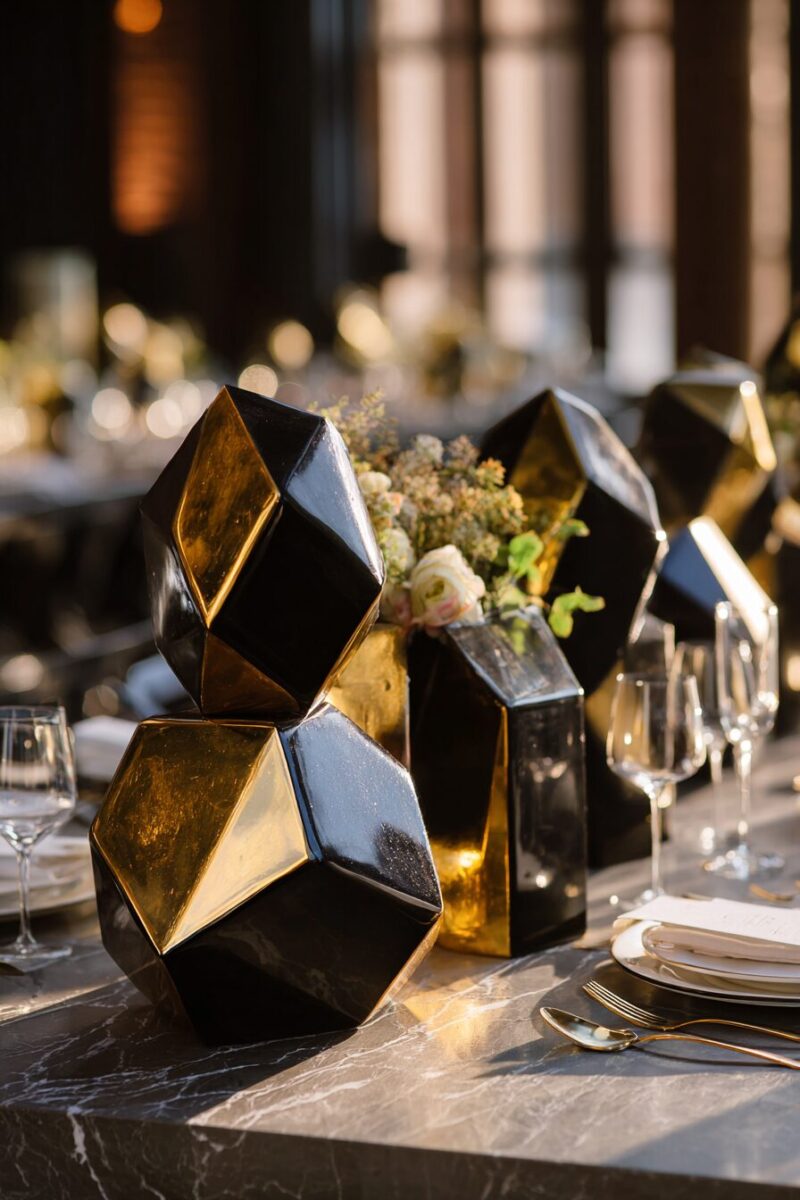Bold geometric shapes in matte black with gold accents create modern art installations that double as sophisticated centerpieces.