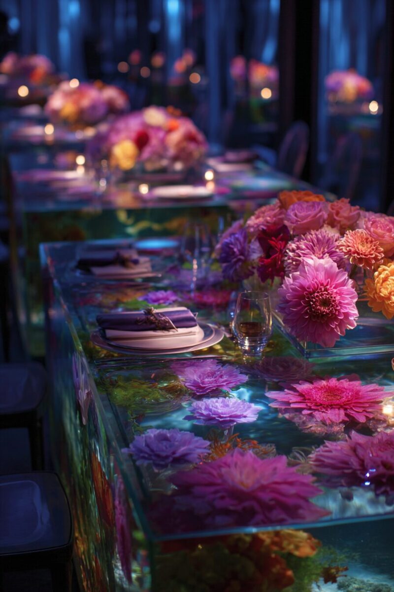 Guests will be mesmerized watching the gentle movement of flowers and light, creating a calming, meditative atmosphere perfect for intimate dinner conversation.