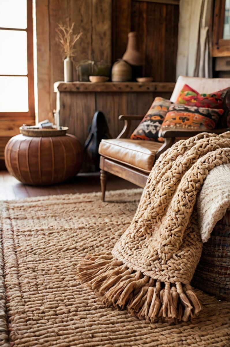 You’ll want to choose natural fiber options like jute, sisal, wool, or cowhide that connect to the organic materials central to Western design.