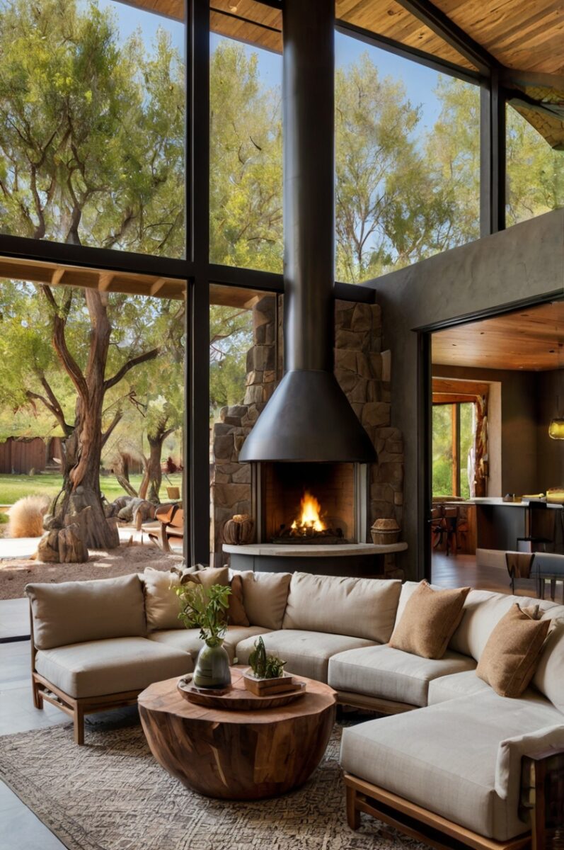 You’ll want to incorporate materials typically used outdoors—stone, concrete, natural wood—inside your living room to create visual continuity with the surrounding environment.
