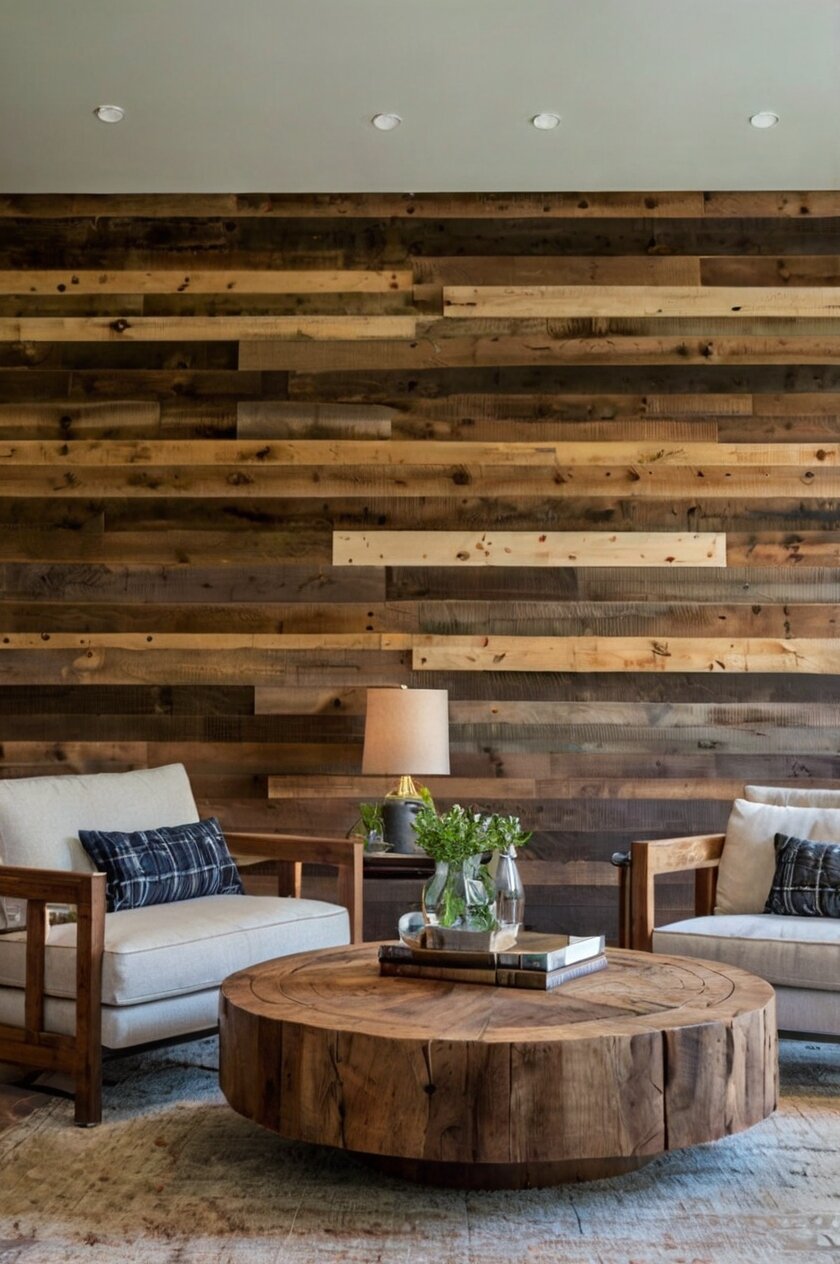 You can treat the entire wall behind your sofa or fireplace with reclaimed wood, creating a strong focal point that anchors your furniture arrangement.