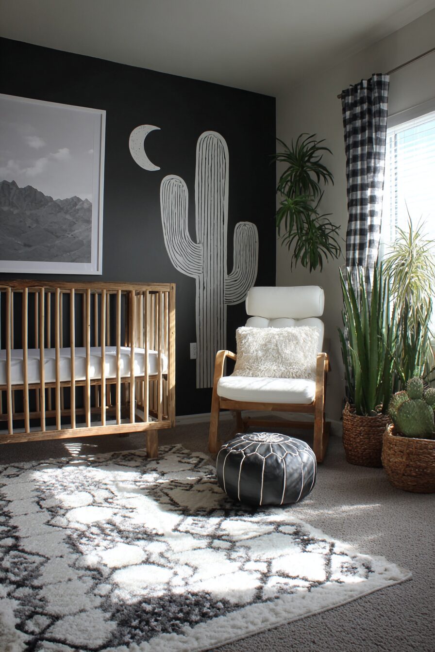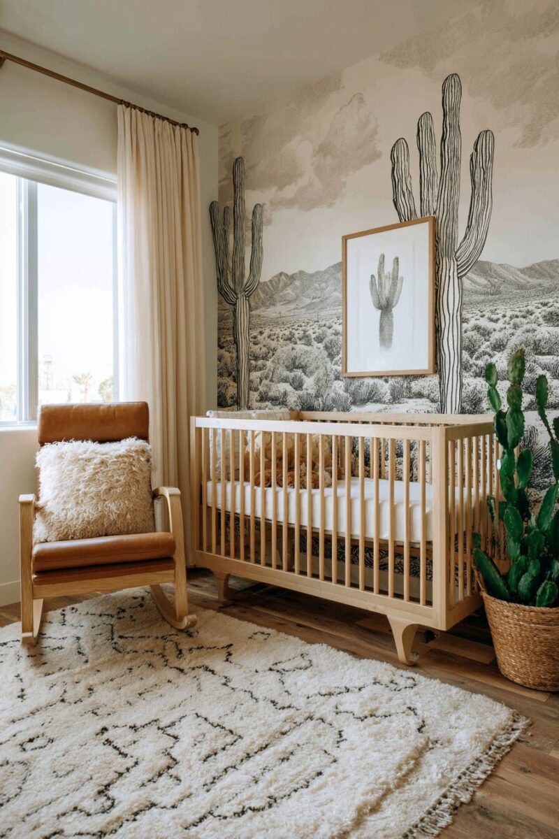 Design a captivating desert landscape corner that brings Southwestern beauty into your nursery without any actual thorny plants.