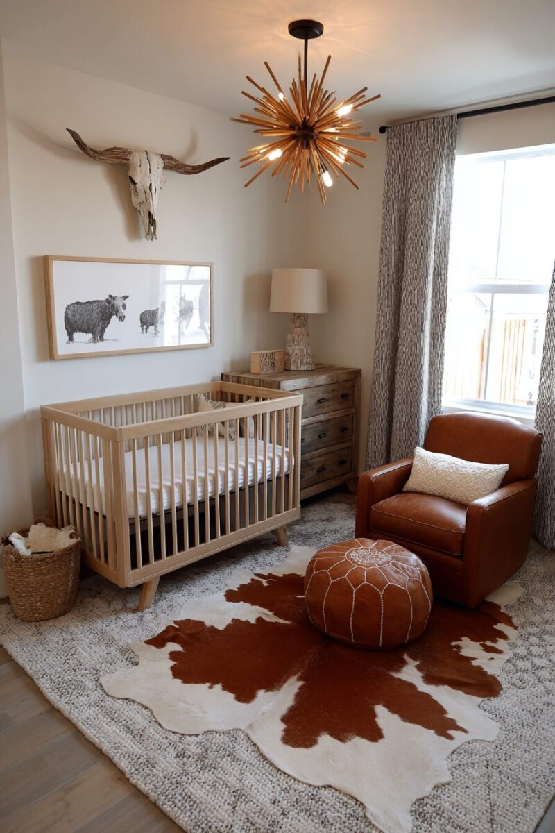 Anchor your Western nursery with an authentic cowhide rug that provides both comfort and unmistakable ranch authenticity.