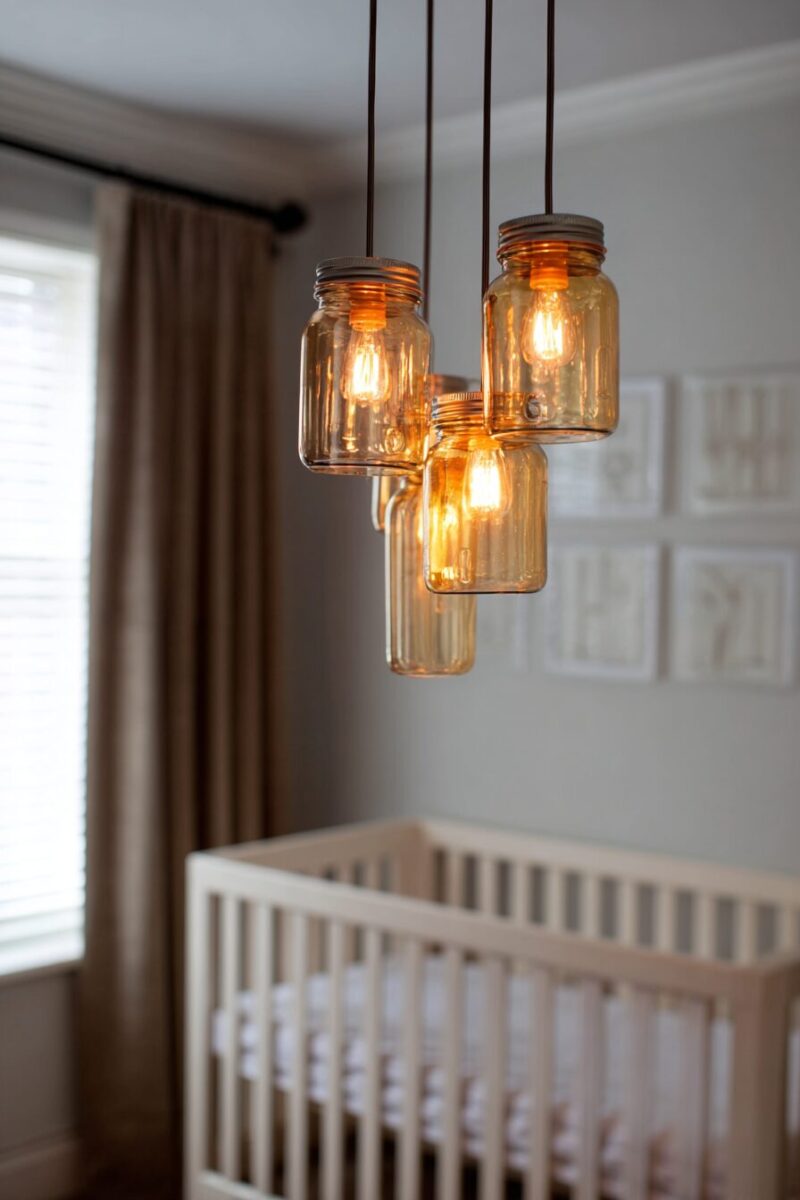 Traditional canning jars transform into beautiful light fixtures that cast warm, filtered light perfect for nursery activities and bedtime routines.