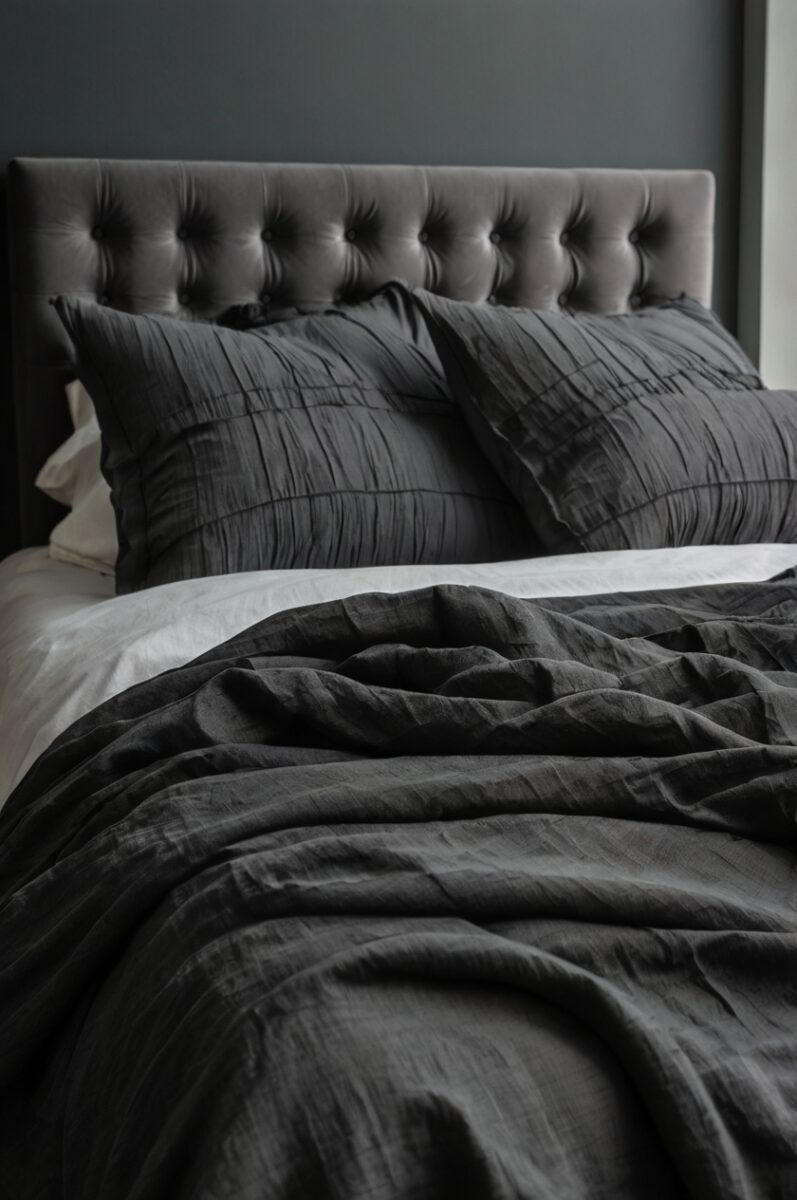 Add visual interest through different textures—perhaps a quilted duvet, knitted throw, and silk pillowcases—all in varying gray tones.