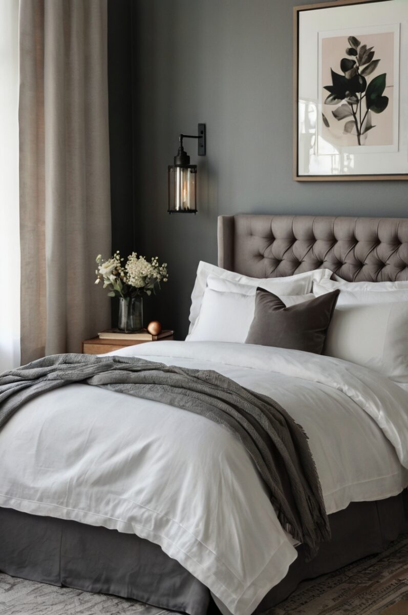 Gray-on-gray styling works beautifully in modern, minimalist spaces or industrial-inspired bedrooms with exposed elements.