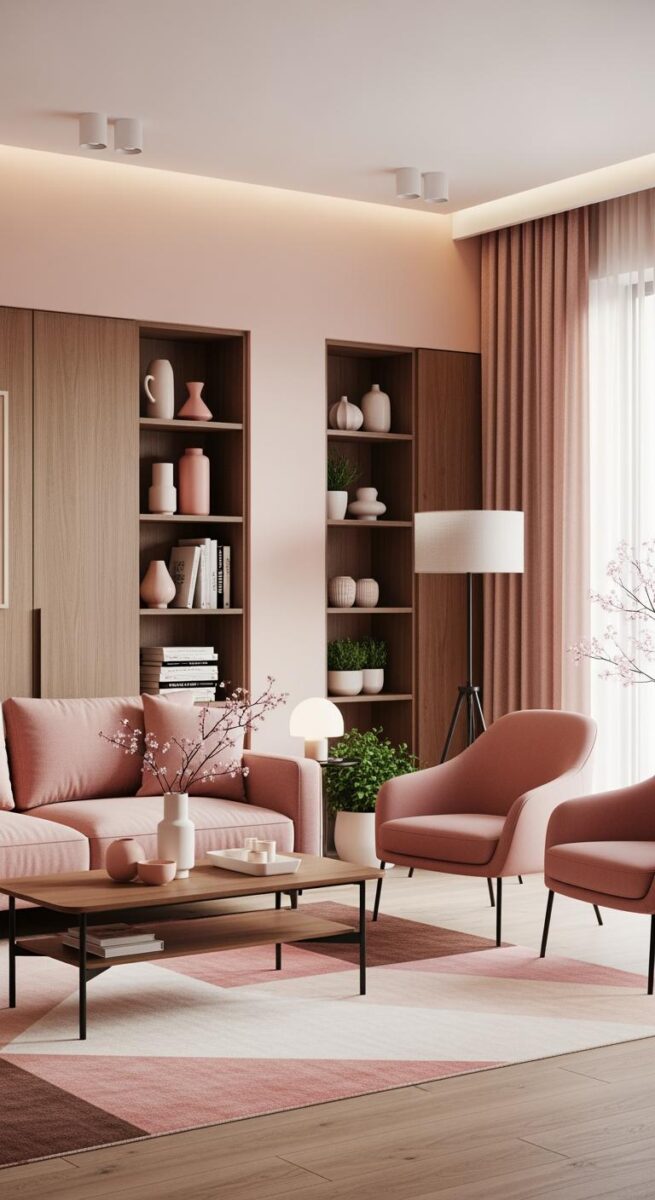 The warmth of the brown furniture balances the softness of the pink beautifully.