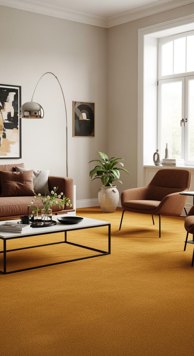 Gold or mustard carpets with brown furniture create this warm, inviting, slightly vintage vibe that I’m totally here for.