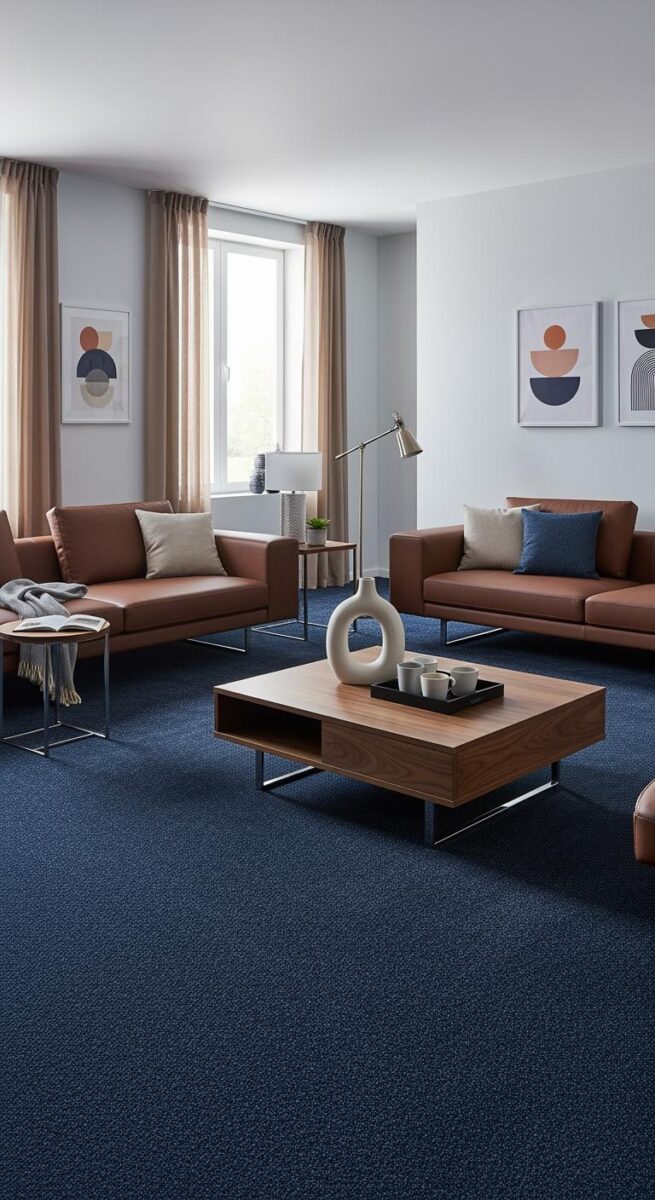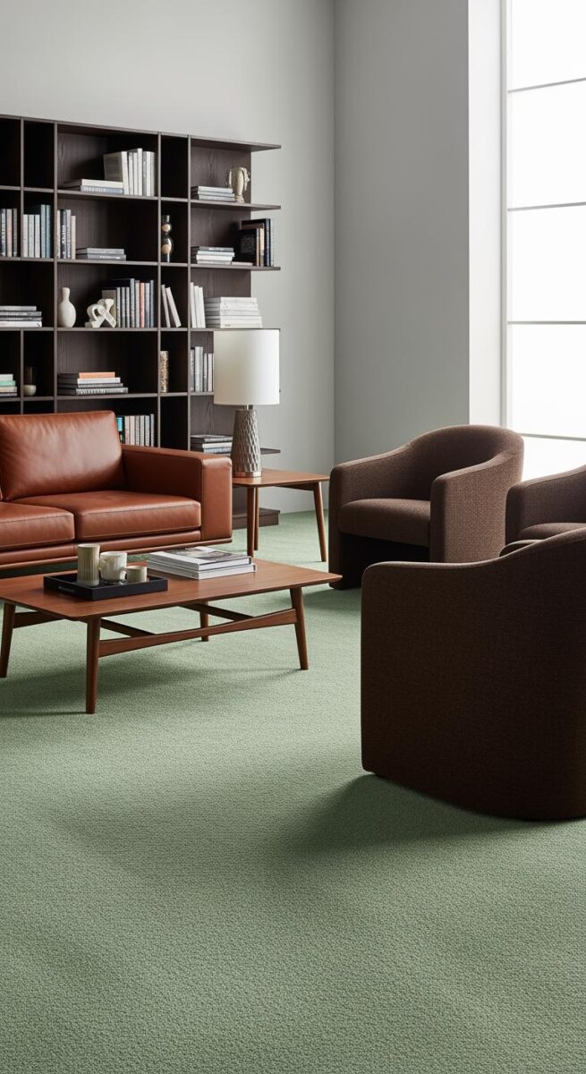 Green carpet might sound wild, but a soft sage or moss green with brown furniture is absolutely stunning.
