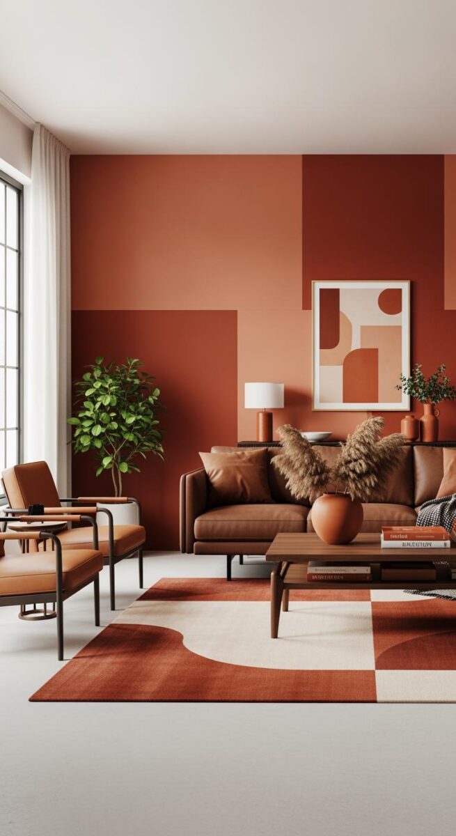 Rust or terracotta carpets with brown furniture create this cozy, bohemian vibe that I absolutely adore.