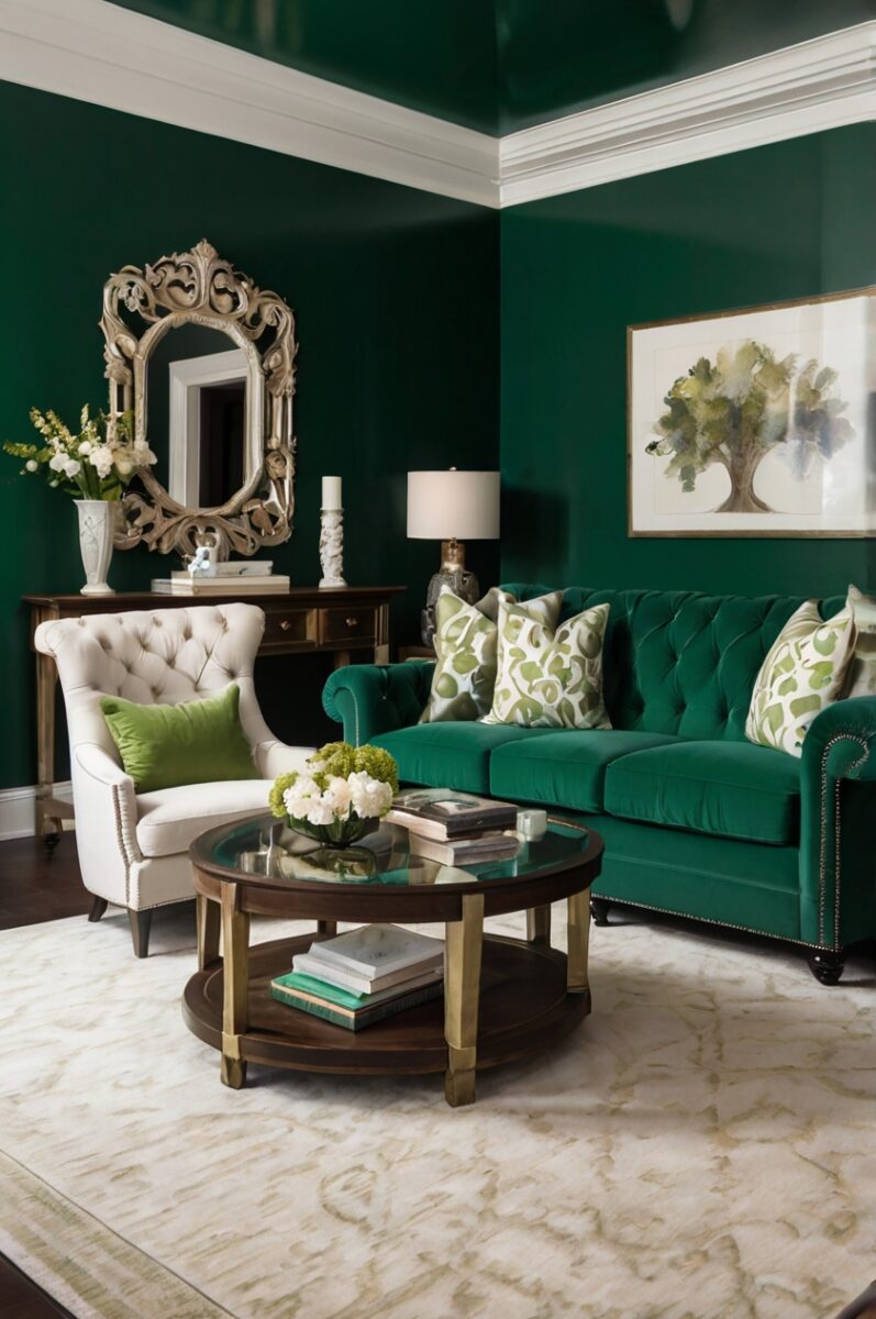 Gold or brass accents enhance this pairing naturally, adding warmth that complements both the ivory carpet and emerald walls.