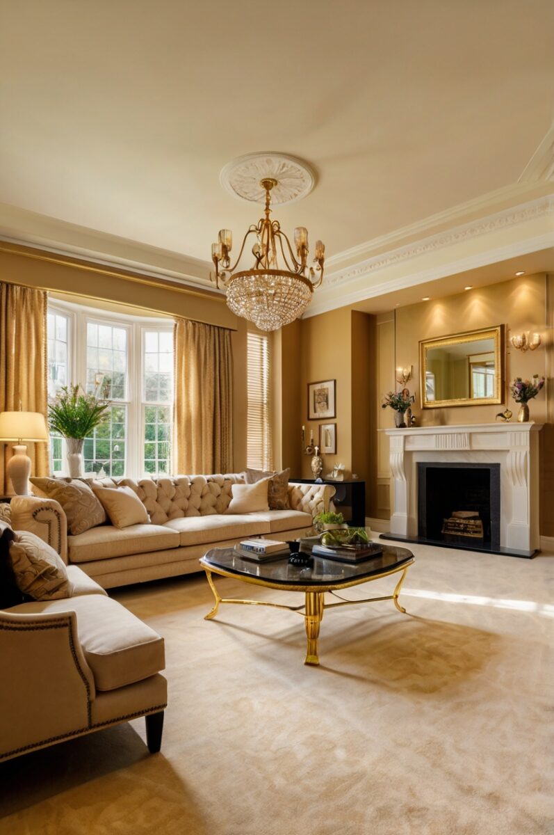 Living rooms with cream carpets and gold walls feel welcoming yet sophisticated.