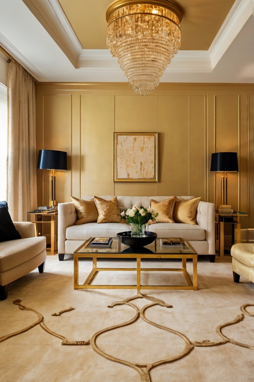 The soft, neutral base allows your gold walls to be the star of the show.