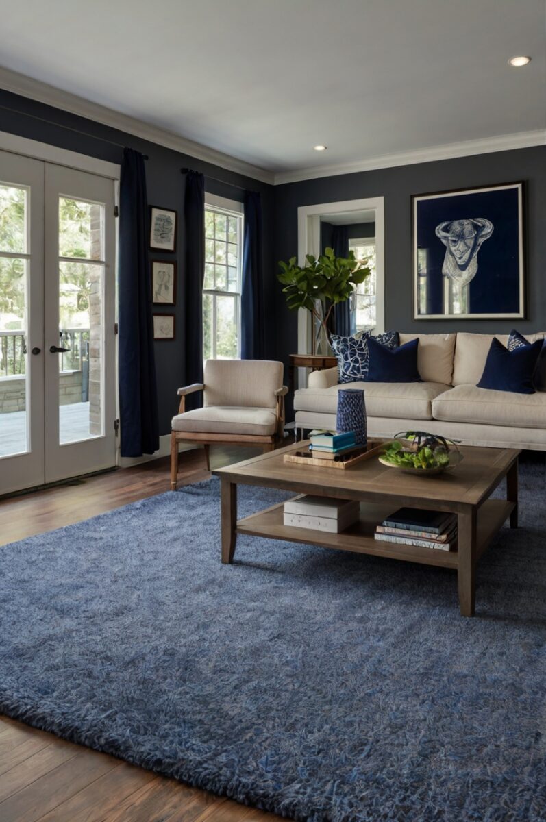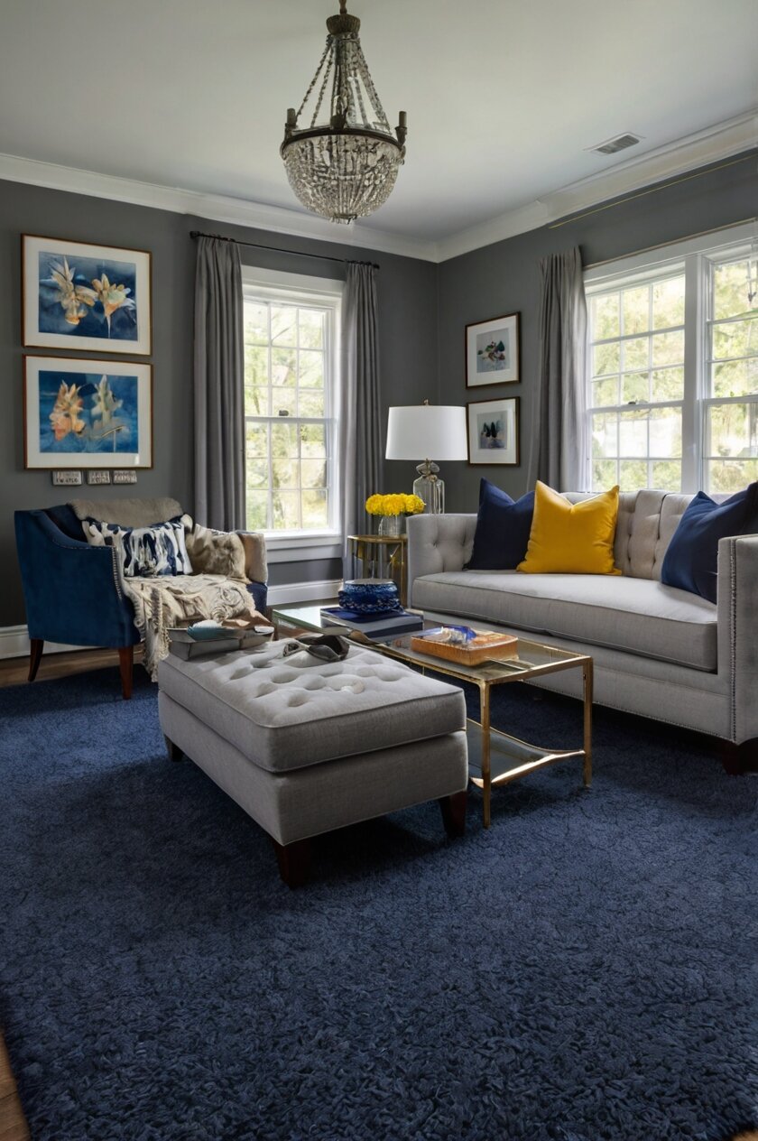 The depth of navy creates beautiful contrast against lighter gray walls, anchoring your space and adding visual weight to the floor.