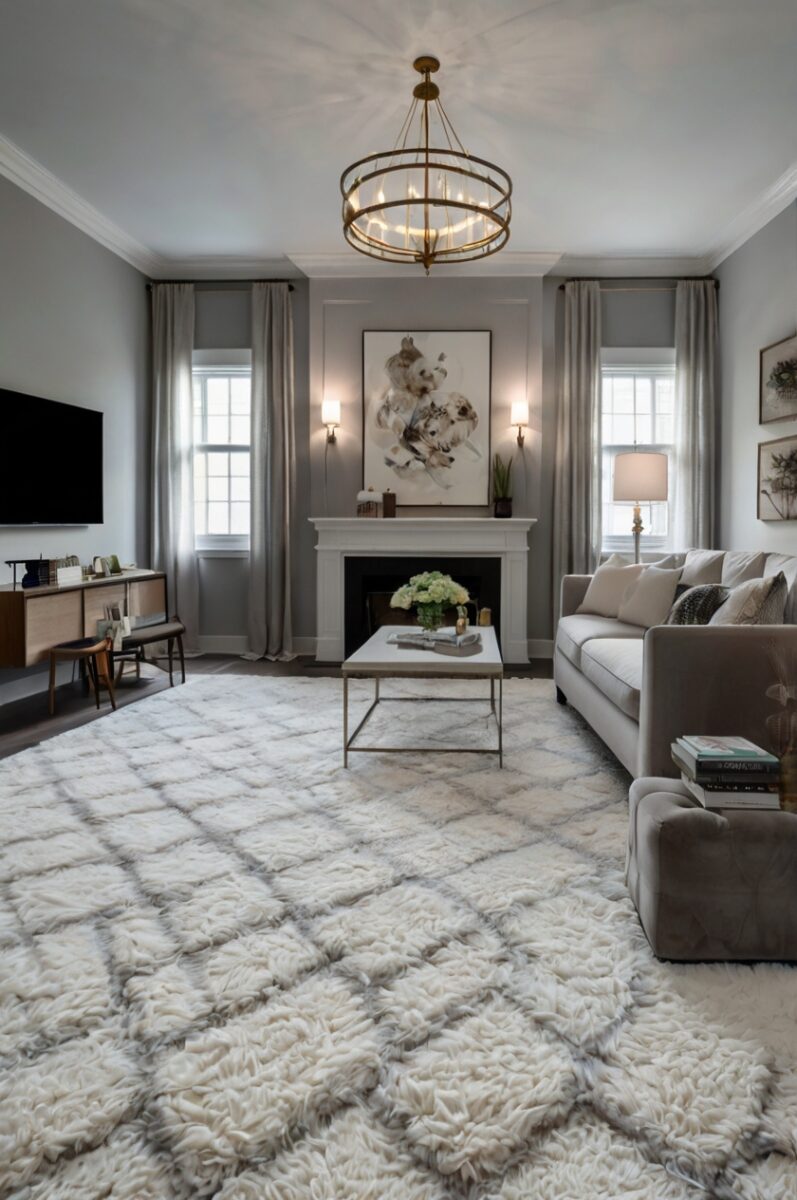 White carpet with gray walls establishes a contemporary, minimalist aesthetic that feels both fresh and sophisticated – perfect for modern homes seeking a clean, uncluttered look.