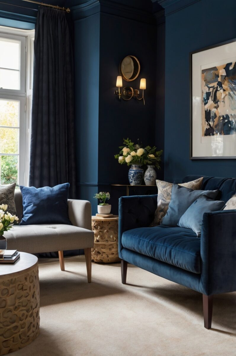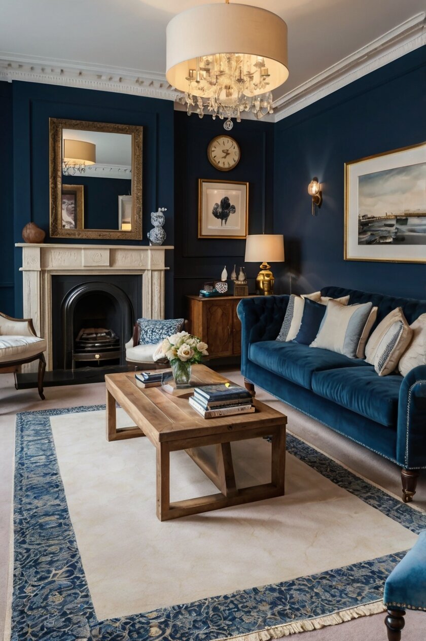 This combination works particularly well in smaller spaces where you want to prevent the dark blue walls from making the room feel cramped.