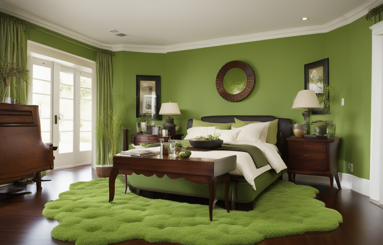 Olive carpet may seem like a bold choice but mahogany can hold its own with this daring hue.