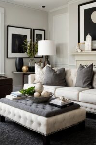 Wood furniture in crisp white or light woods ensure the space feels airy and high-end despite the dark foundation.
