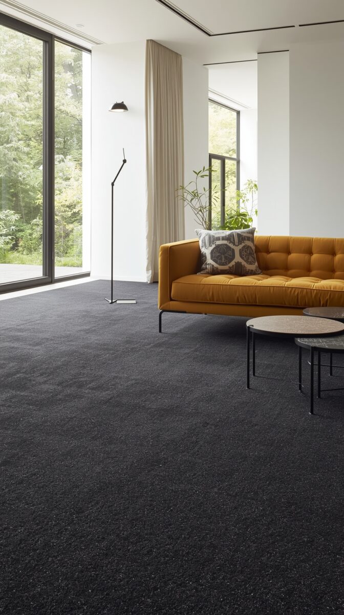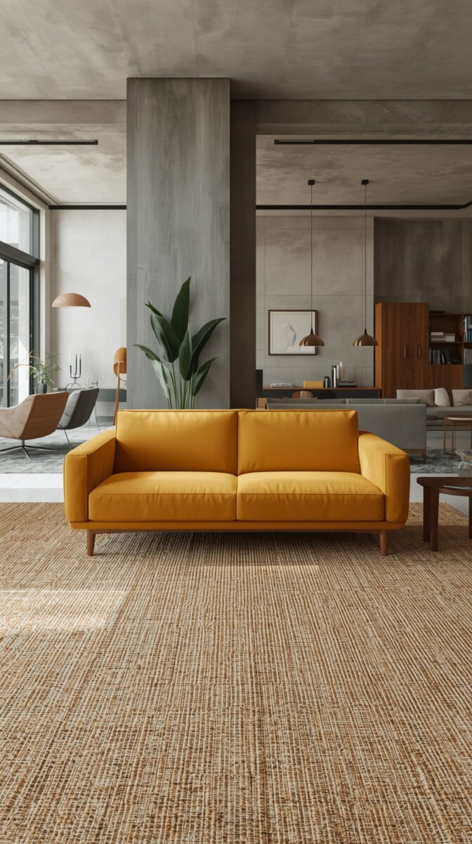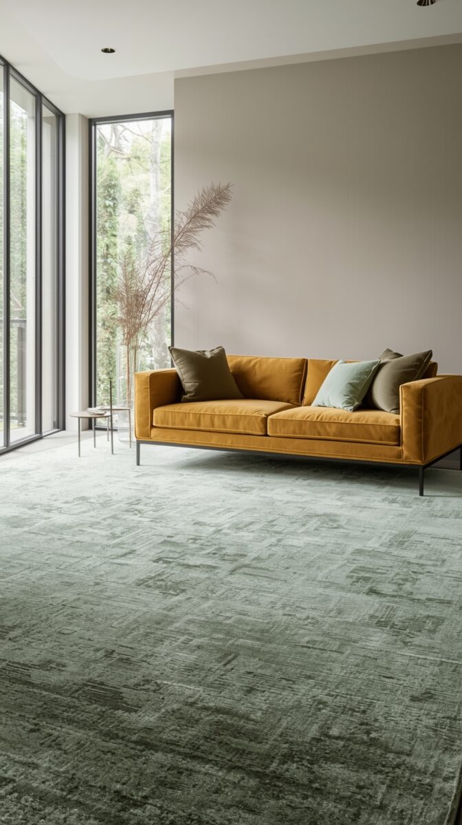 A rich, warm beige or taupe carpet is the ultimate “safe but chic” choice for a mustard sofa.