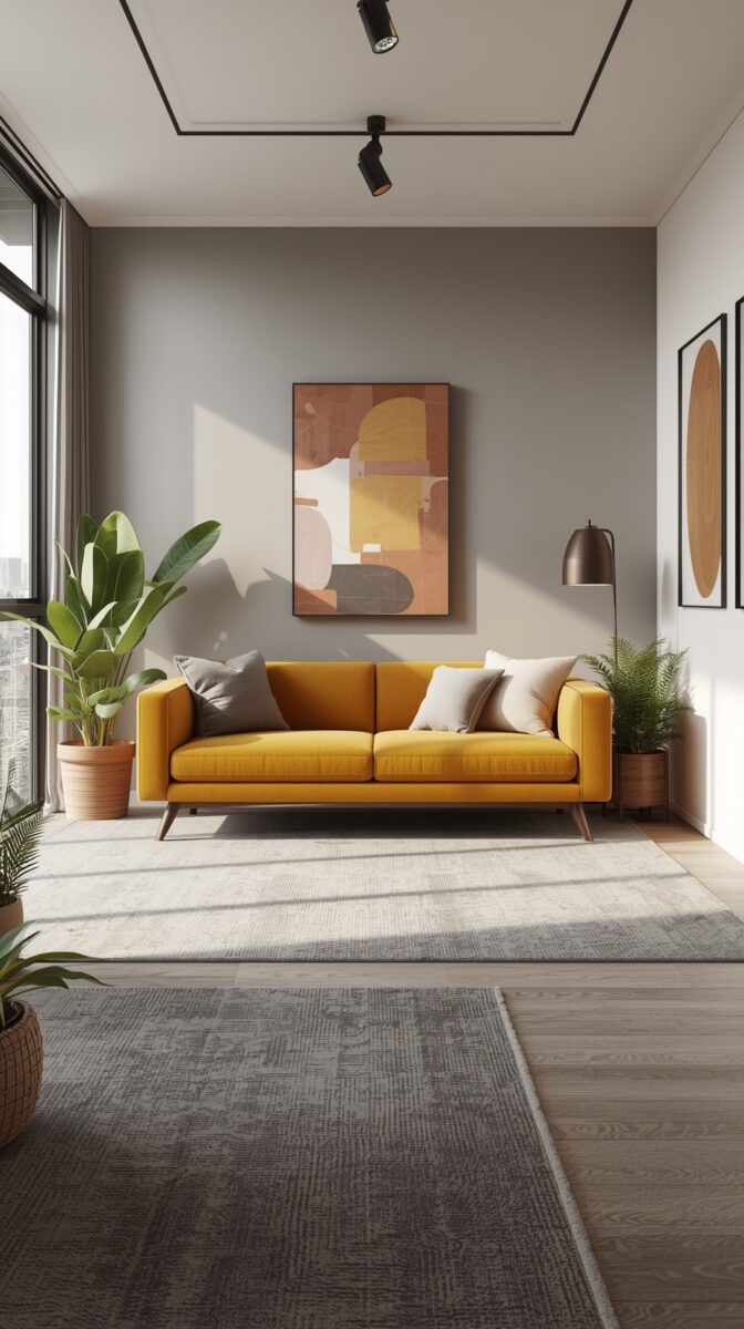 Pro tip: Add some mustard-colored throw pillows or a blanket on the sofa to tie the whole look together.