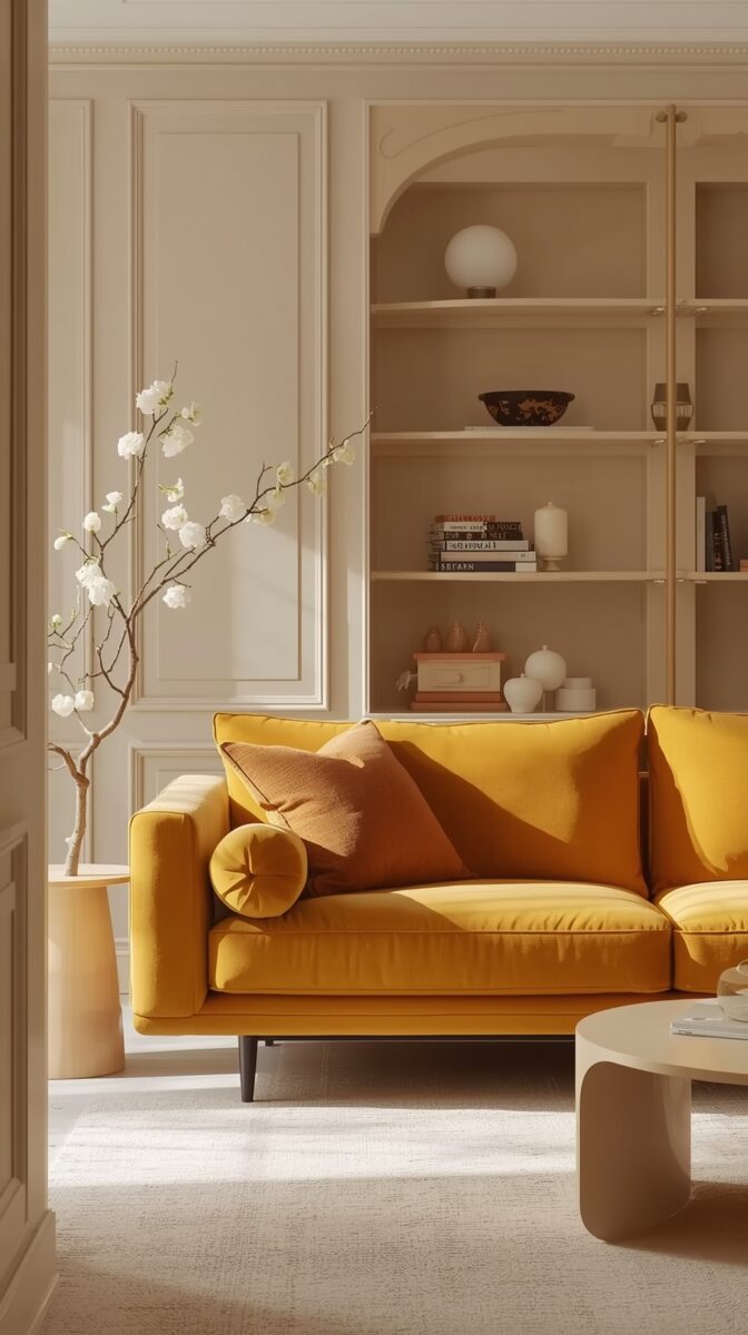 With a mustard sofa, beige creates this warm, monochromatic look that feels effortless.
