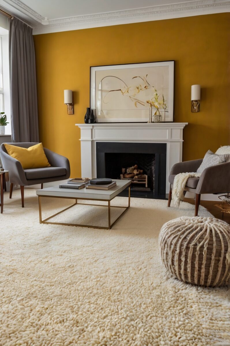 When you pair mustard walls with white carpet, you create a bold look that feels both modern and timeless.