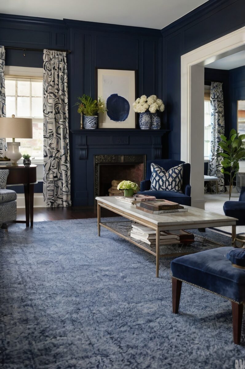 Alternatively, for a bold statement, select patterns where navy becomes a major feature that strongly connects to your walls.