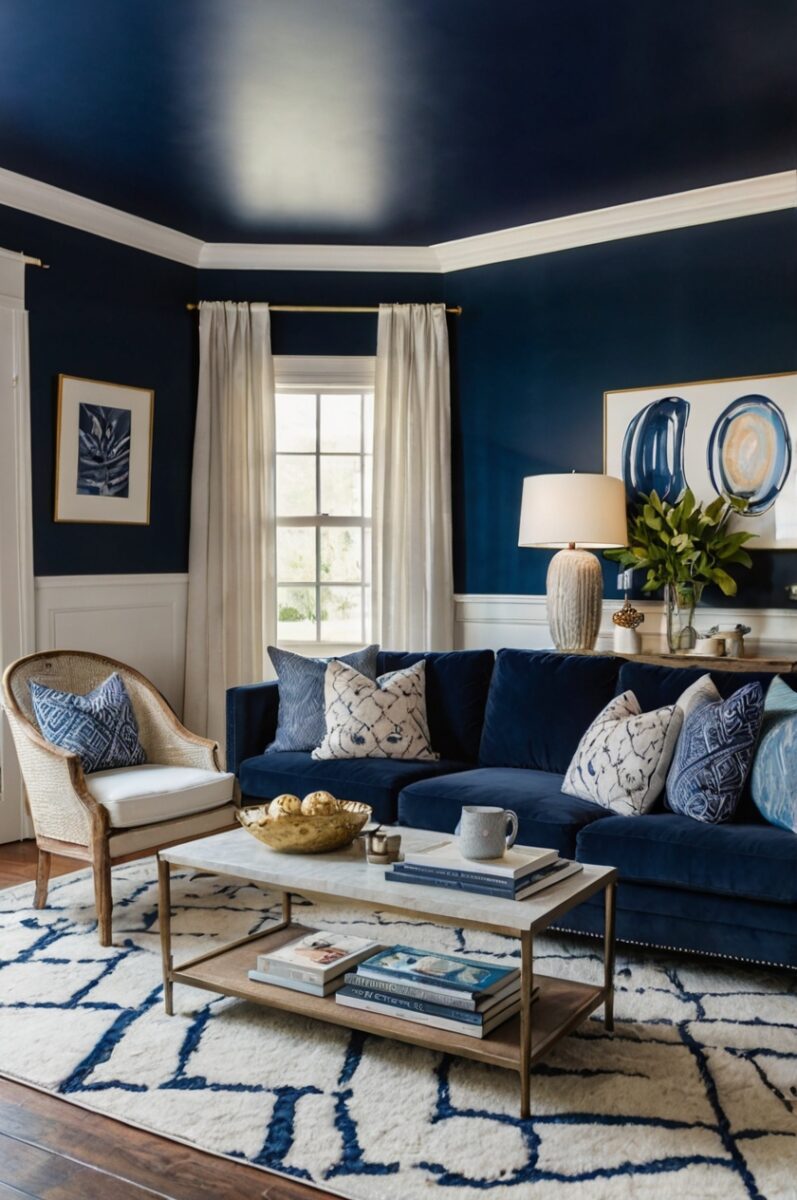 White or light-colored furniture and accessories become striking focal points against this deep blue backdrop.