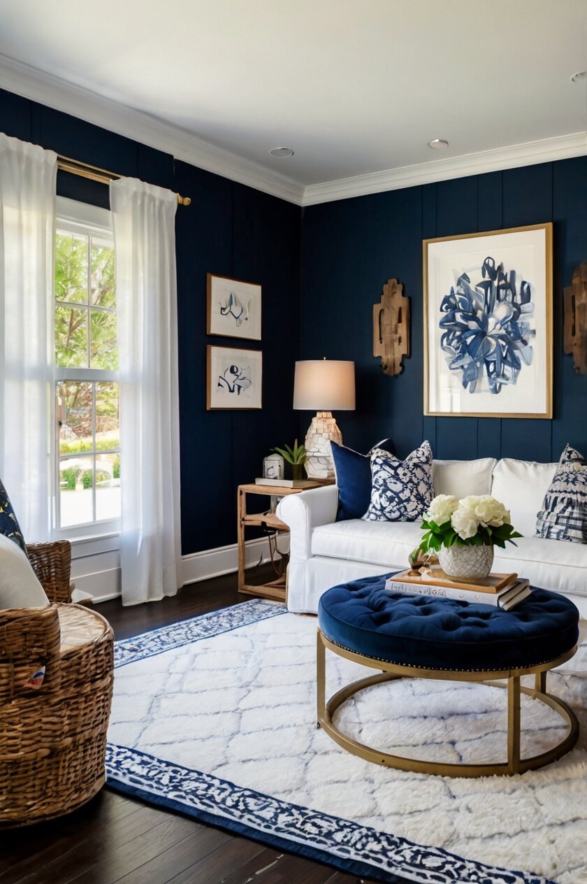 Remember that different shades of white—from stark bright white to softer ivory or cream—will create slightly different effects against your navy walls.