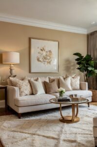 Consider adding texture through a patterned beige carpet to add visual interest without disrupting the color harmony.