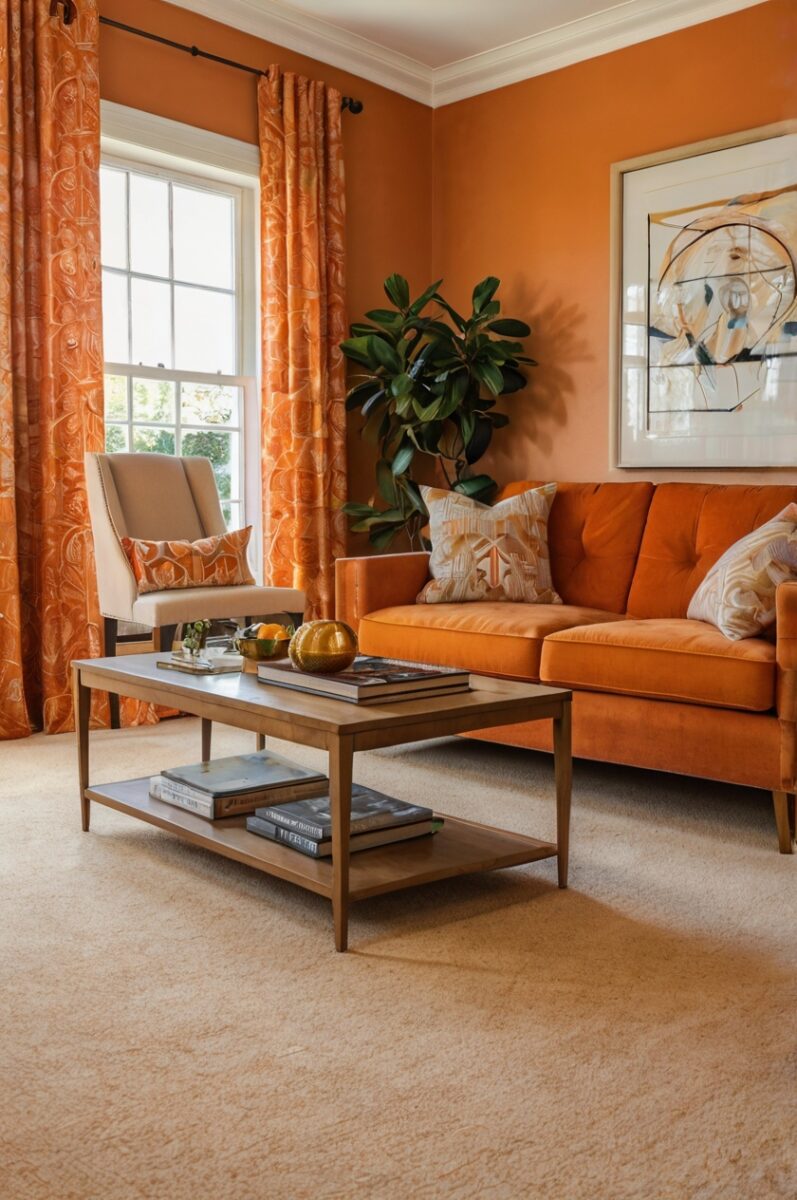Cream carpet creates a soft, sophisticated foundation that complements orange walls without competing for attention.