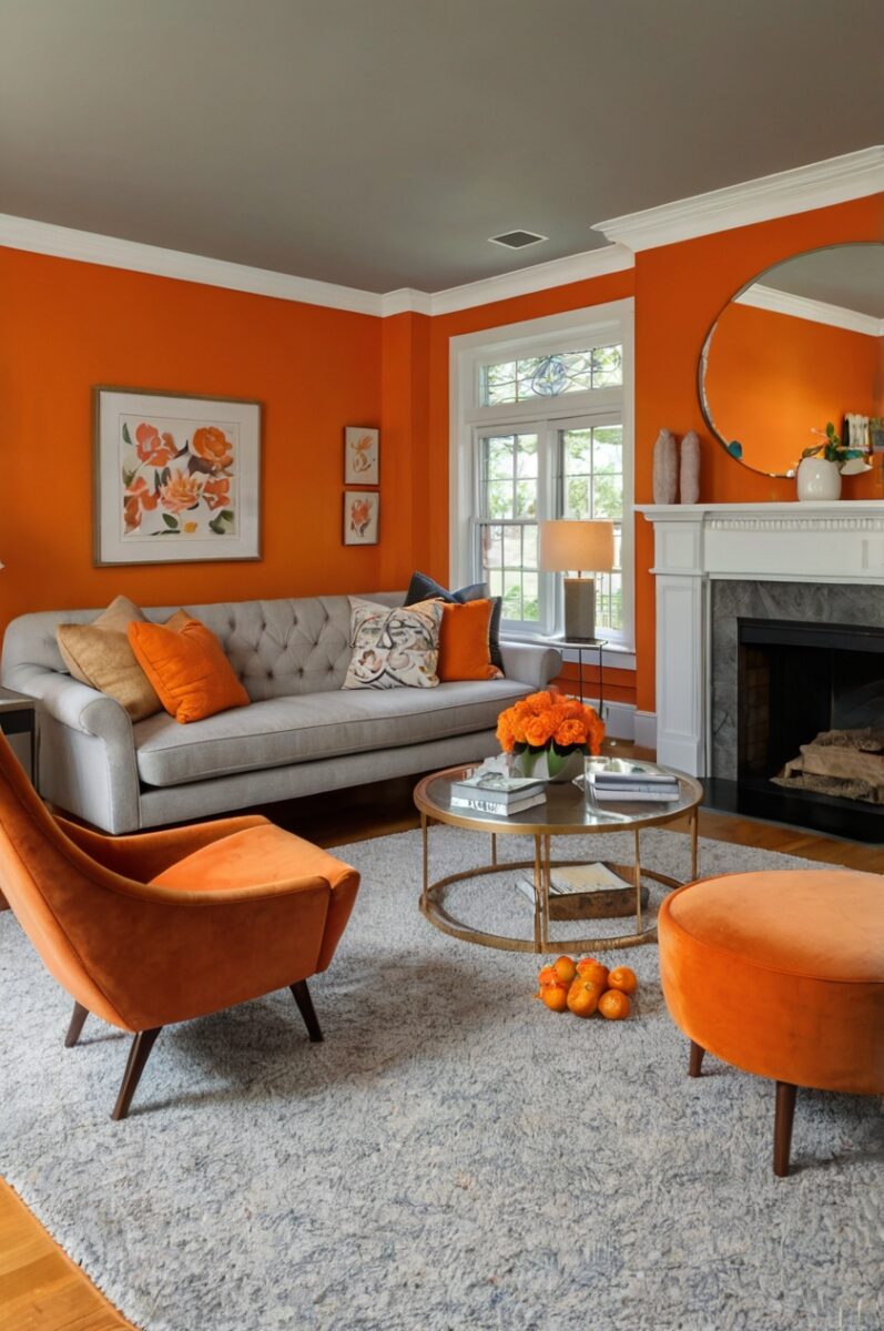 The gray carpet serves as a neutral foundation that allows your orange walls to become the star of the show.